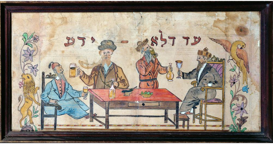 Chassiden feiern Purim zusammen mit einem sefardischen Juden. Safed, 19. Jh., ©YIVO.